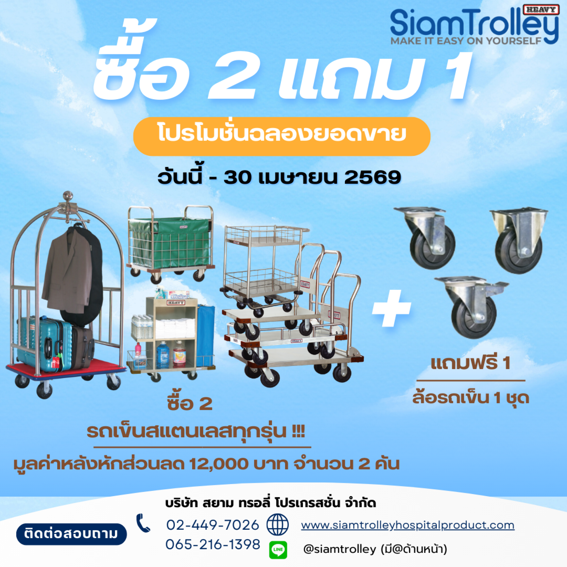 แถมฟรี ชุดล้อ 1 ชุด เมื่อซื้อรถเข็นสแตนเลส รุ่นใดก็ได้ 2 คัน ที่มีมูลค่าหลังหักส่วนลด 12,000 บาท ขึ้นไป (ราคาไม่รวม VAT 7%)